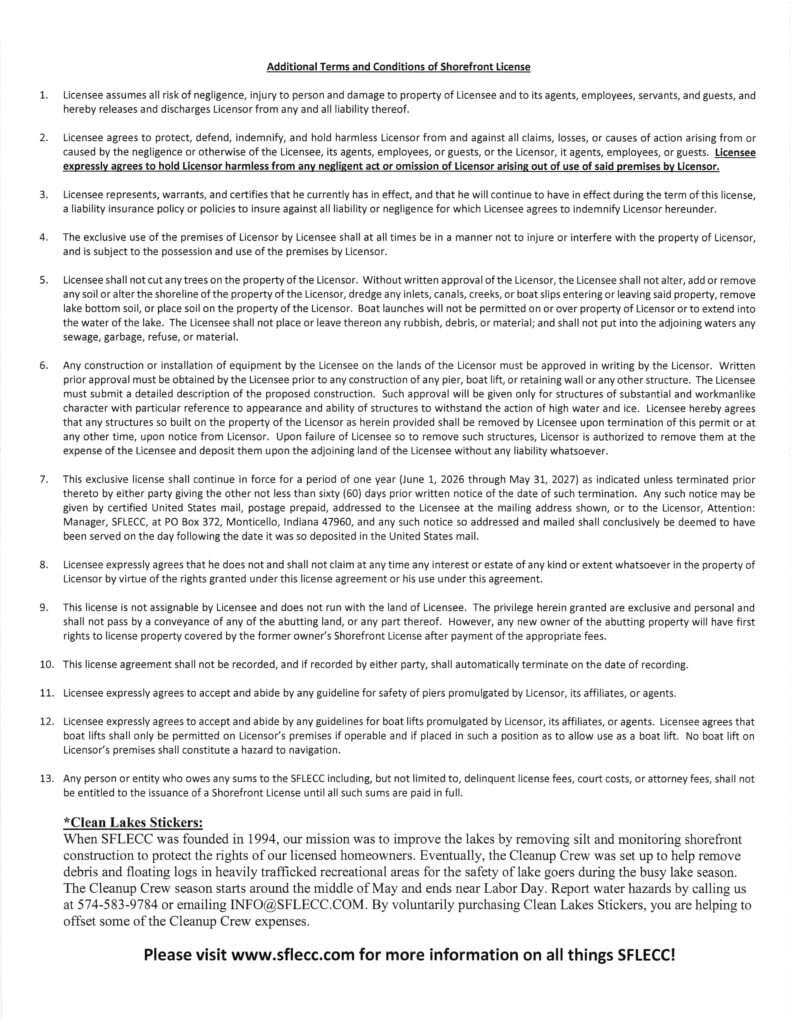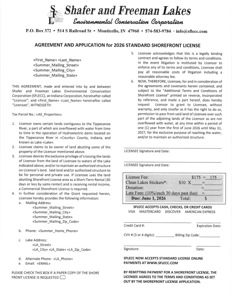 The Annual Meeting of the Shafer Freeman Lakes Environmental Conservation Corporation will be on Saturday, August 23rd, 2025 at the SFLECC Office – 514 S Railroad Street Monticello, IN 47960. The meeting will begin at 10:00 a.m.